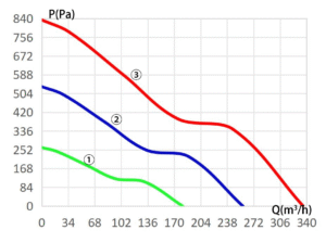 | Model | Voltage (V) | Operating Voltage Range (V) | Power (W) | Speed (RPM) | Airflow (m³/h) | Static Pressure (Pa) | Noise (dBA) | Curve |